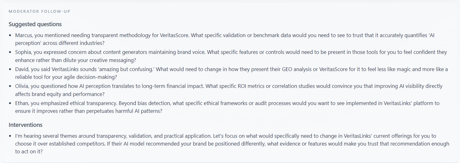 This block surfaces “Suggested questions” the moderator could ask in a follow-up session and, when present, “Interventions”—notes on where the discussion should be steered (clarify pricing, proof, objection handling, etc.). It is operational guidance for the next round, not a summary of what was said.